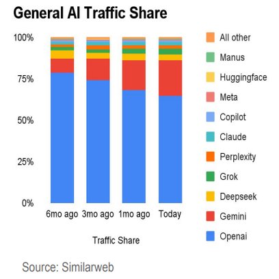 この1年でもGeminiは5.7%→21.5%大きくシェアを伸ばし、一方ChatGPTは86.7%→64.5%にシェアが大きく下落という厳しいデータもあります。(Webアクセスベース)